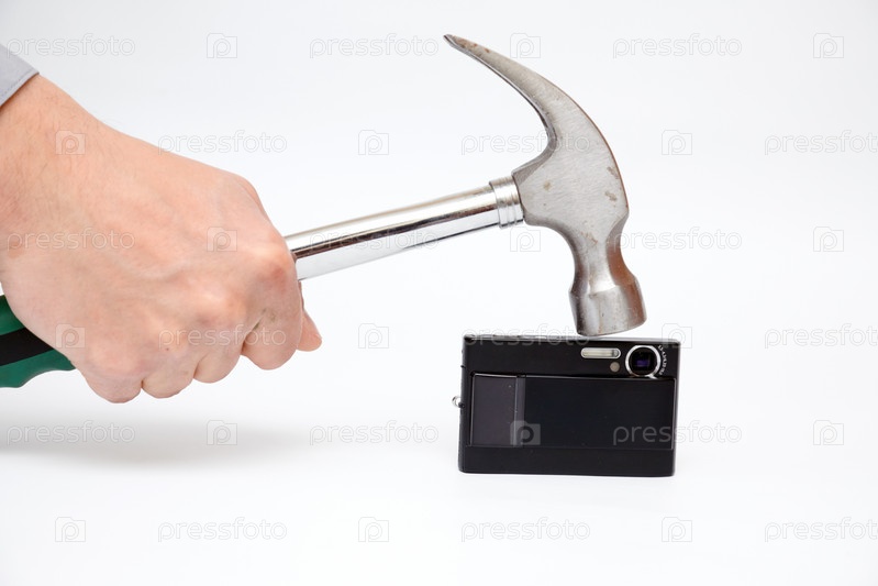 Молоток ударяет по фотоаппарату