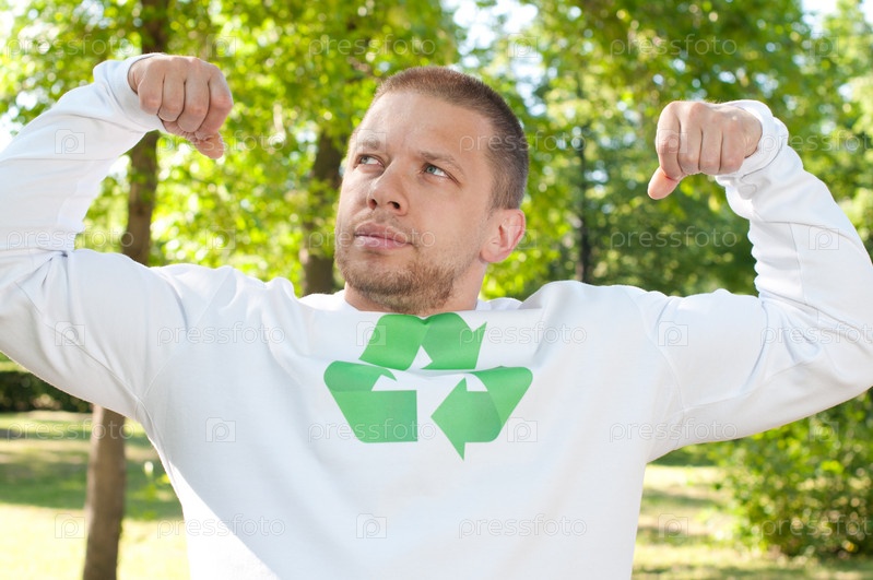 Стронгмен со знаком утилизации на футболке демонстрирует бицепсы