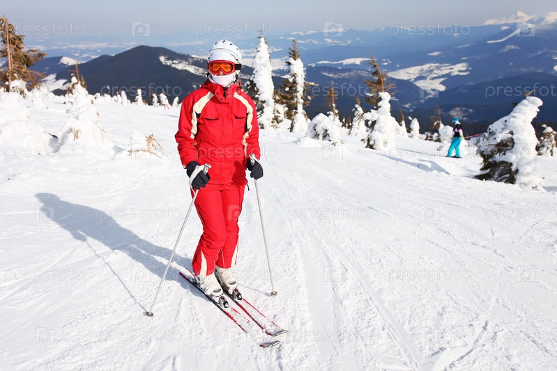 Лыжница стоит на склоне горы