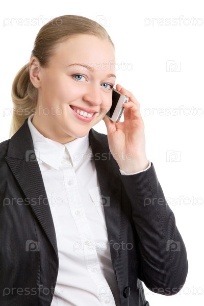 Счастливая деловая женщина говорит по сотовому телефону, изолированная на белом