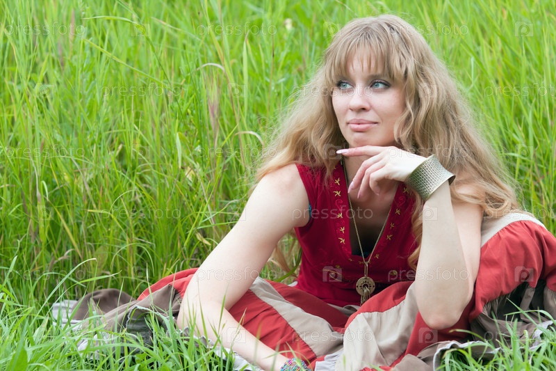 Мечтательная девушка хиппи сидит на траве