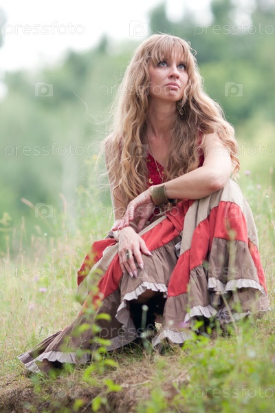 Мечтательная девушка хиппи сидит на траве