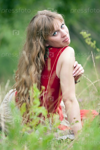 Девушка хиппи сидит на траве