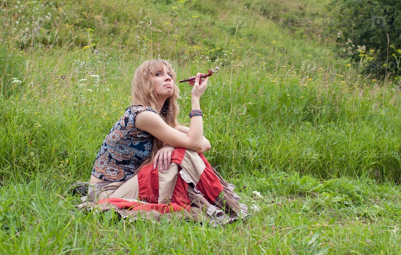 Женщина хиппи курит трубку
