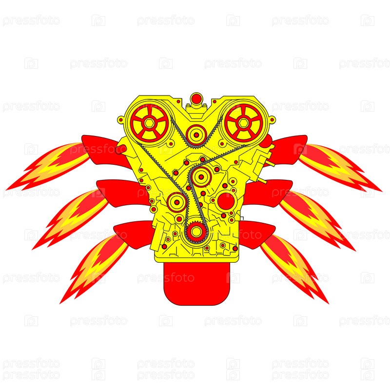 Двигатель внутреннего сгорания с огнем из выхлопной трубы. Векторная иллюстрация