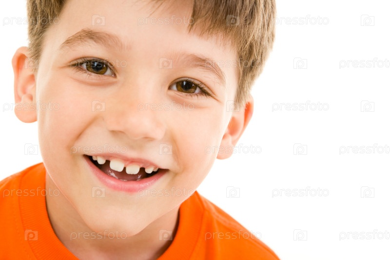 Лицо улыбающегося мальчика с коричневыми глазами на белом фоне