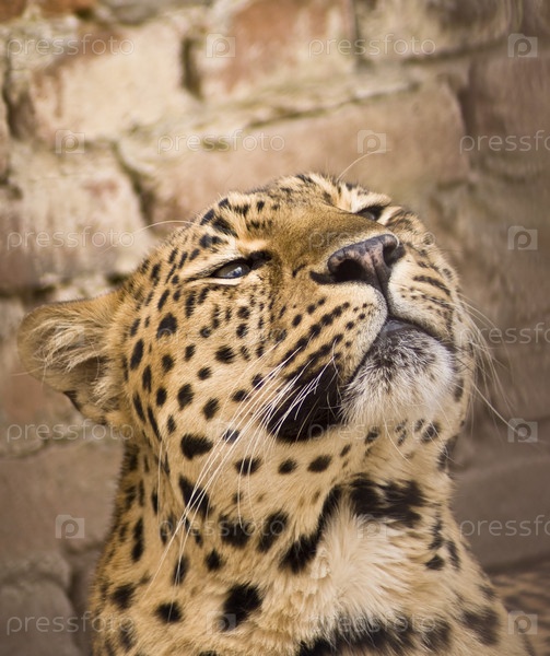 Портрет высокомерного леопарда на фоне кирпичной стены