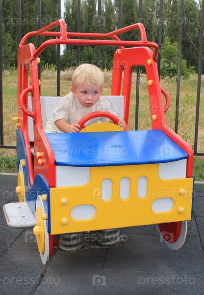 Ребенок едет на игрушечной машине в парке