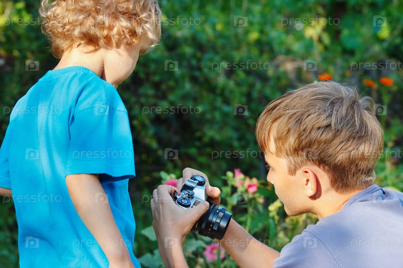 Молодые братья с фотокамерой на открытом воздухе