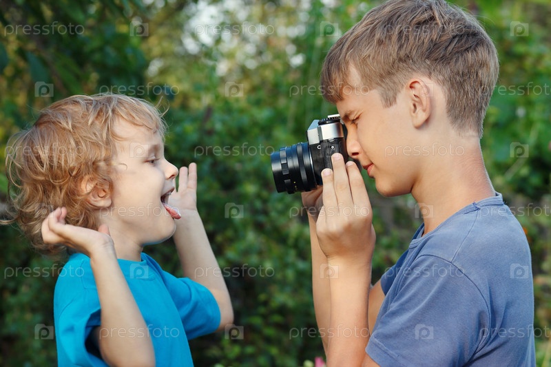 Молодой фотограф с фотокамерой снимает брата на открытом воздухе