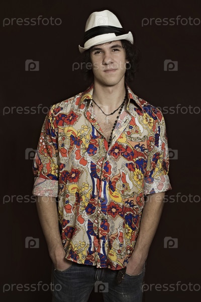 Портрет молодого человека в разноцветной рубашке и белой шляпе на черном фоне