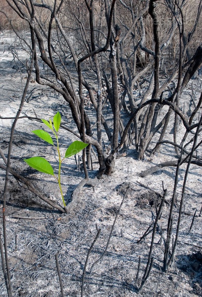 Сгоревший лес и зеленый росток