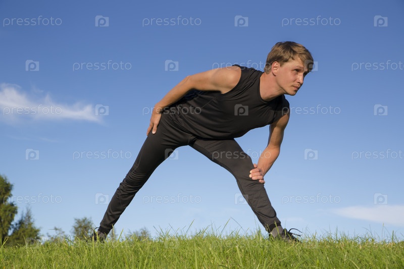 Спортсмен растягивает мыщцы ног