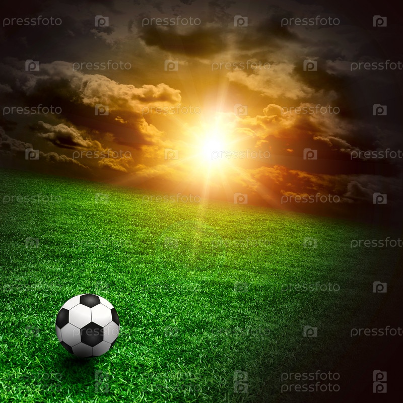 Прекрасный зеленый луг с футбольным мячом на закате