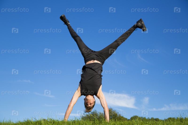 Спортсмен стоит на руках для проверки координации