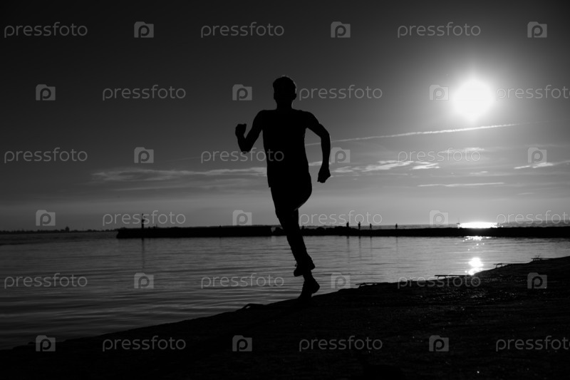 Спортсмен совершает пробежку по пляжу поздно вечером