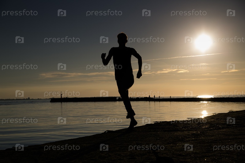 Спортсмен совершает пробежку по пляжу поздно вечером