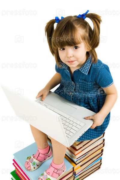 Фото школьницы, сидящей на книгах и учащейся пользоваться ноутбуком