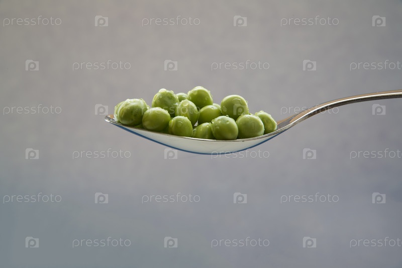 Зеленый горошек, готовый к употреблению в пищу, на ложке