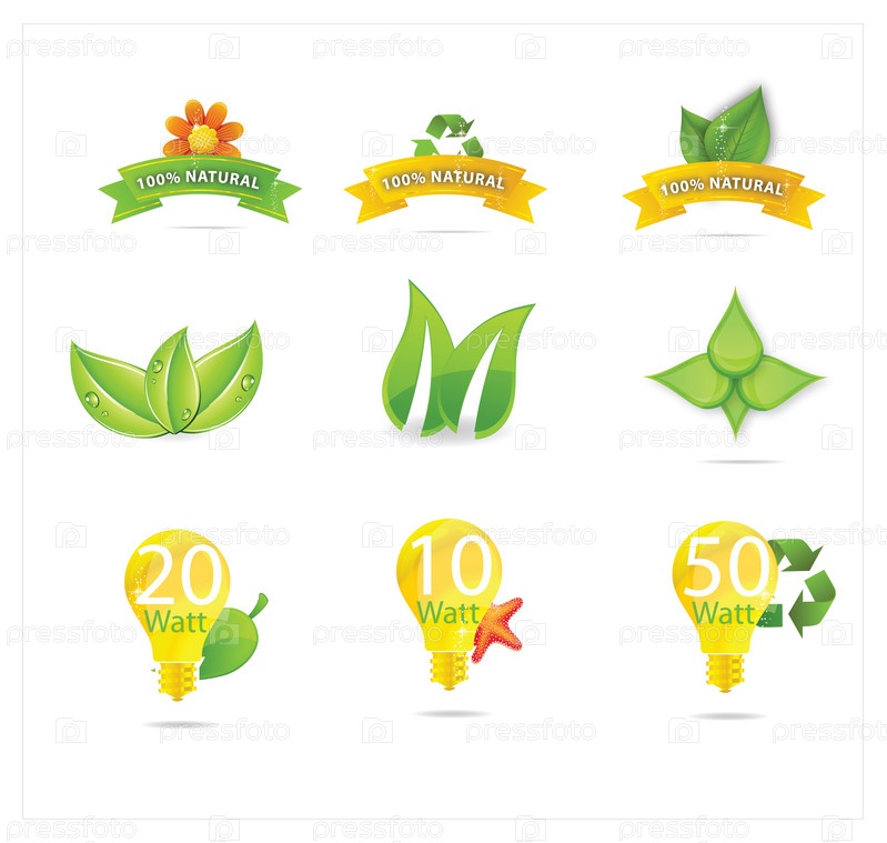 Зеленые листья и эко-символы на белом фоне