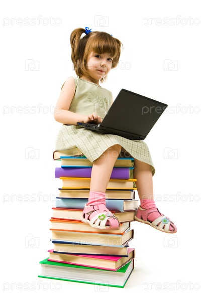 Портрет умной девушки, сидящей на книгах с ноутбуком перед собой и печатающей