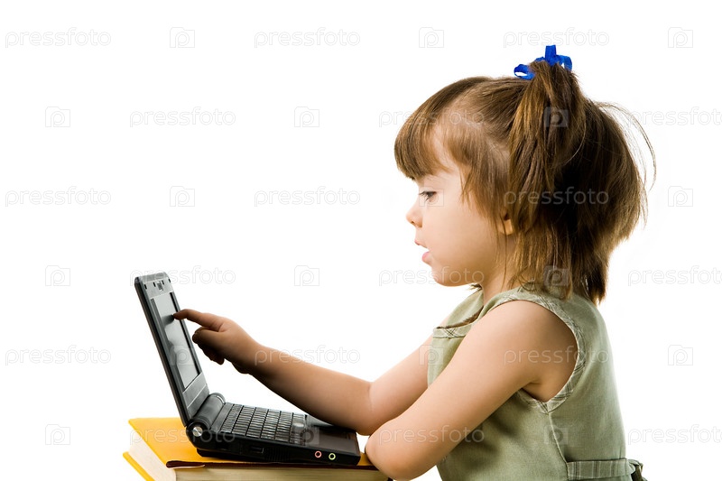 Профильный вид серьезного дошкольника, указывающего на дисплей ноутбука