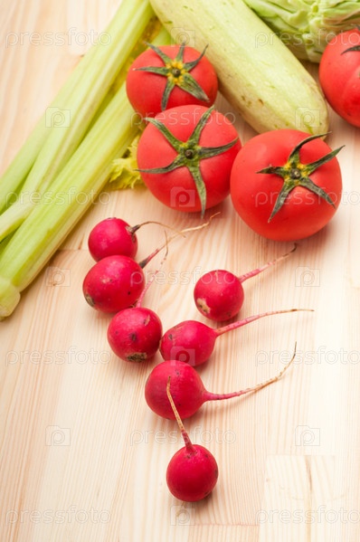 Свежий редис и овощи крупным планом на сосновом столе