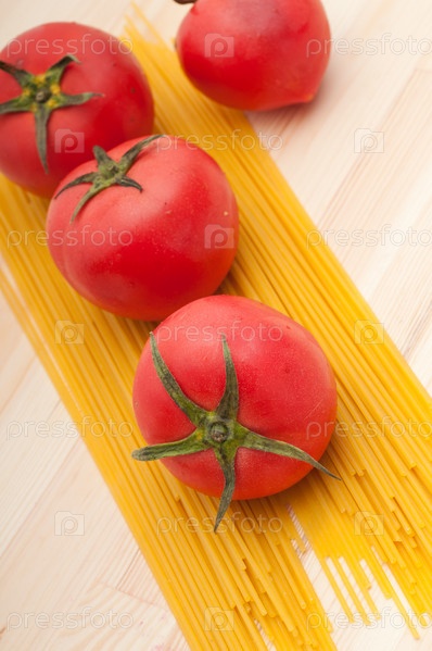 Свежие помидоры и сырые спагетти на сосновом столе