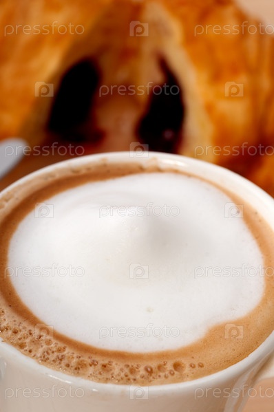 Французские свежие круассаны с ягодным вареньем и кофе. Традиционный итальянский завтрак
