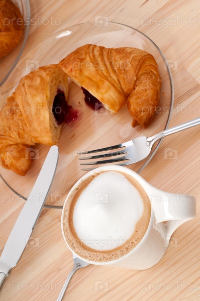 Французские свежие круассаны с ягодным вареньем и кофе. Традиционный итальянский завтрак