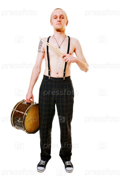 Молодой барабанщик, изолированный на белом фоне