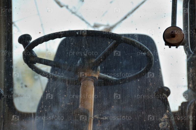 Кабина водителя и рулевое колесо промышленного оборудования за грязным ветровым стеклом