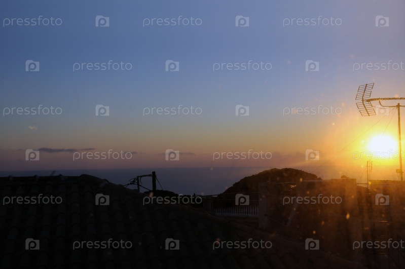 Закат отражается на стекле окна, крыши деревни