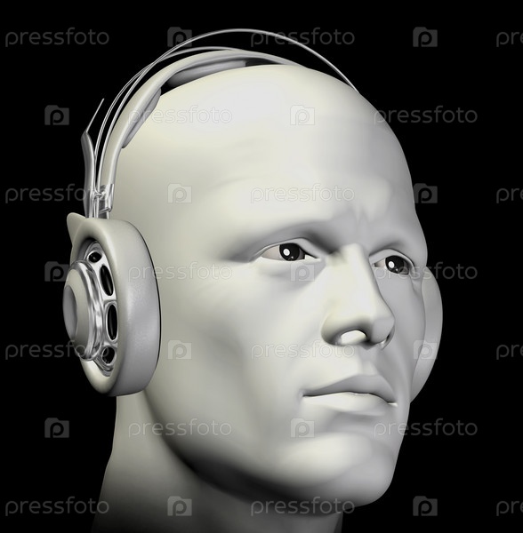 Человек слушает музыку в наушниках. Трехмерная иллюстрация