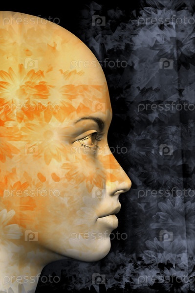 Женский профиль и абстрактный цветочный узор. 3D иллюстрация
