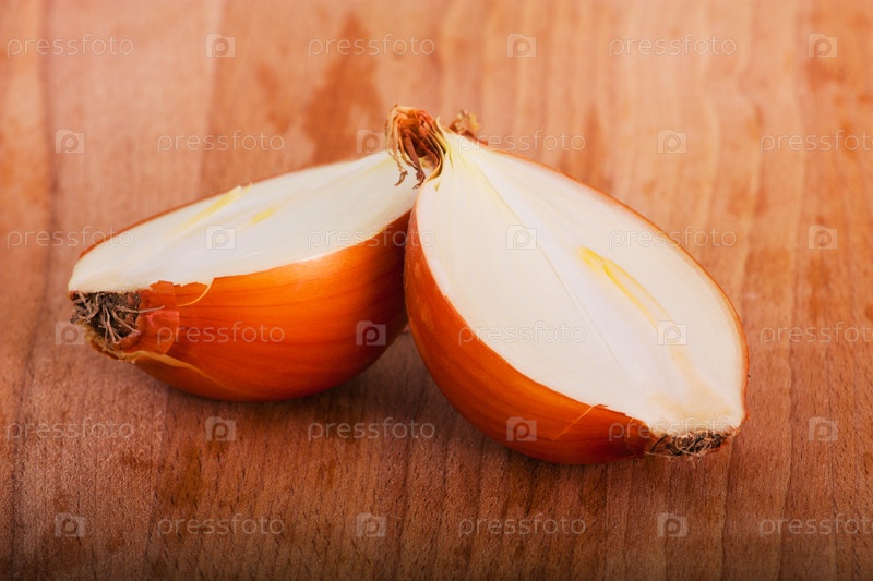 Две половинки желтого лука на деревянной доске