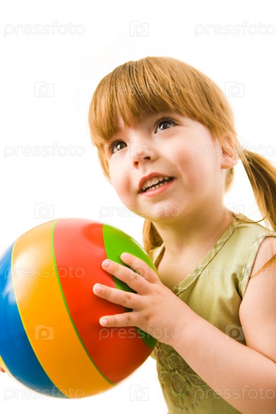 Вертикальное изображение симпатичной девочки с мячом в руках, выделенное на белом фоне