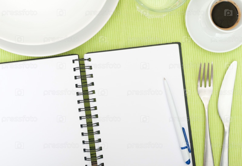 Книга рецептов - открытый пустой дневник С шариковой ручкой на столе