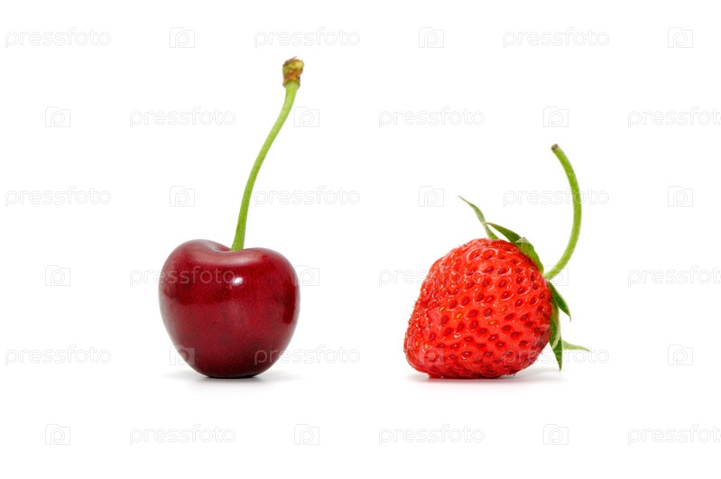 Спелые вишня и клубника, изолированные на белом фоне