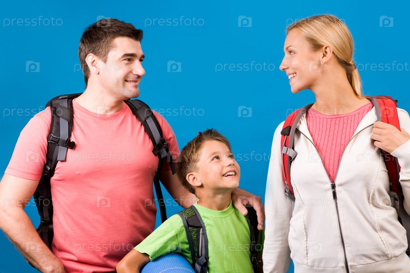 Портрет семьи во время отдыха на синем фоне