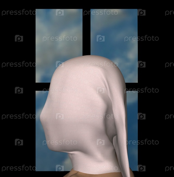 Женская голова, покрытая белой тканью на фоне синего неба в окне. 3D иллюстрация