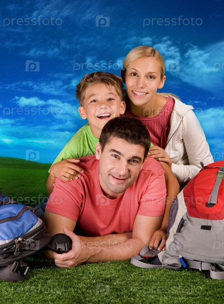 Портрет семьи, лежащей на лугу во время отдыха над голубым фоном неба