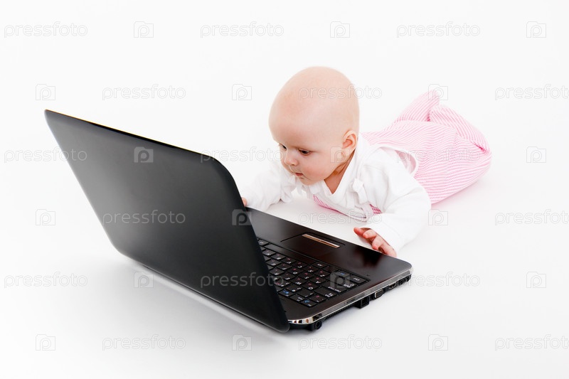 Вундеркинд. Ребенок с ноутбуком лежит на полу в студии