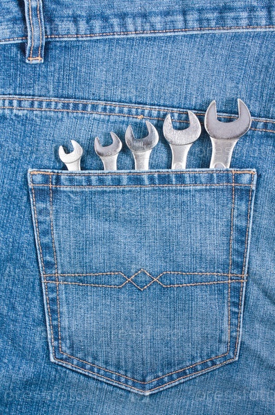 Карман синих джинсов с пятью хромированными гаечными ключами