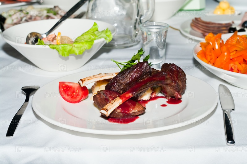 Жареный ягненок с травами на белой тарелке