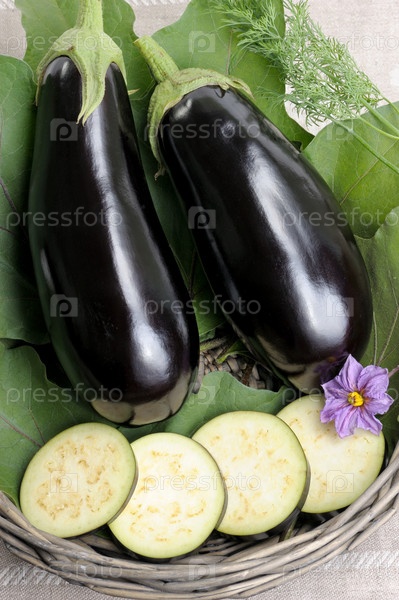 Два баклажана и ломтики на листьях в корзине