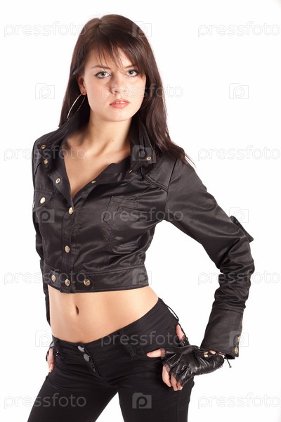 Девушка в кожаной куртке и перчатках на белом фоне
