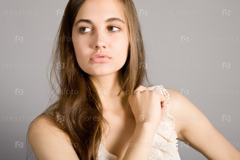 Портрет молодой девушки в элегантном платье на сером фоне