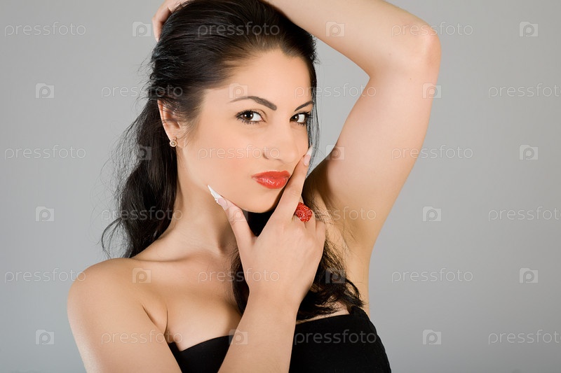 Портрет молодой красивой брюнетки на сером фоне
