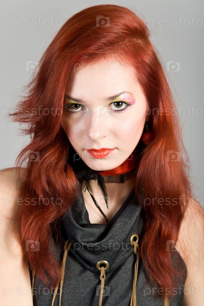 Красивая рыжеволосая девушка на сером фоне